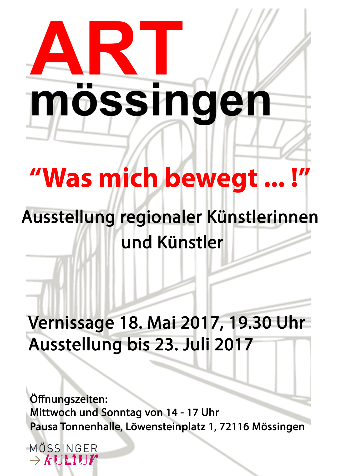 Vom 18. Mai 2017 bis 23. Juli 2017 findet wieder die ARTmössingen statt. Diesmal mit dem Thema „Was mich bewegt…“