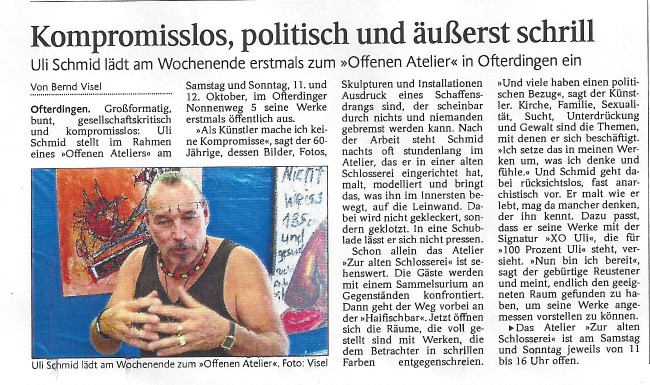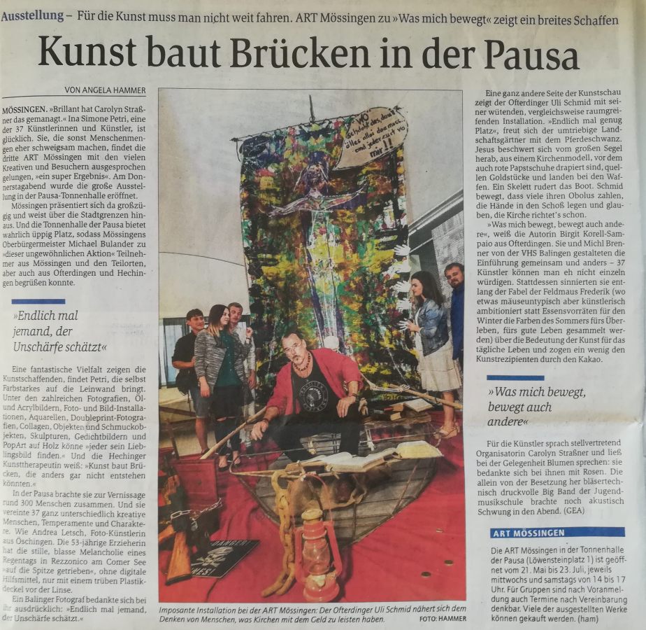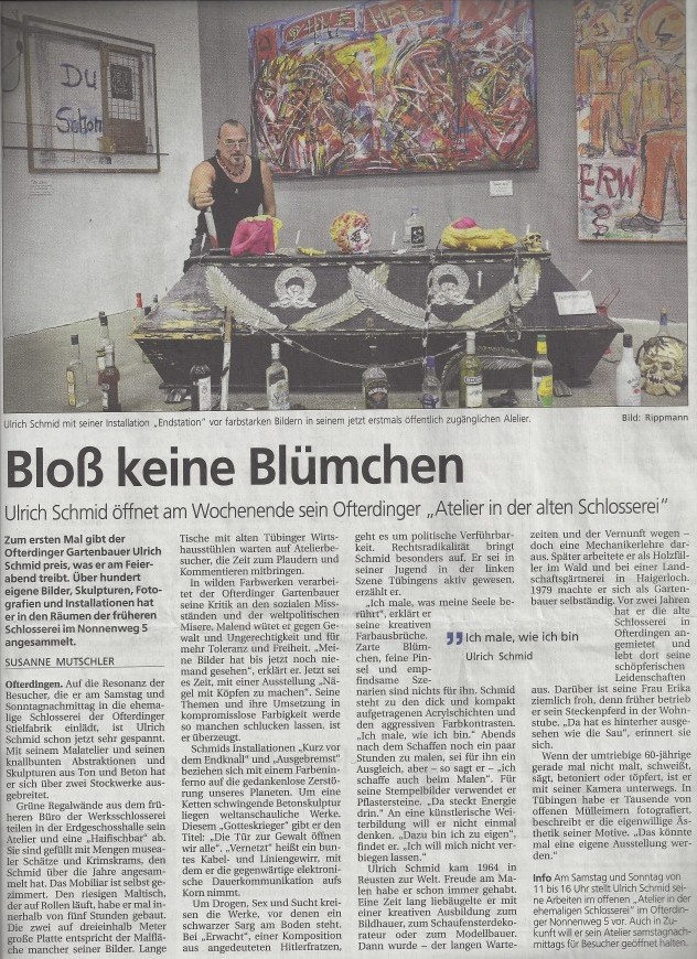 Kunst baut Brücken in der Pausa Reutlinger Generalanzeiger, 20.05.2017 Kompromisslos, politisch und äusserst schrill Schwarzwälder Bote, 08.10.2014 Bloss keine Blümchen Steinlach Bote, 10.10.2014